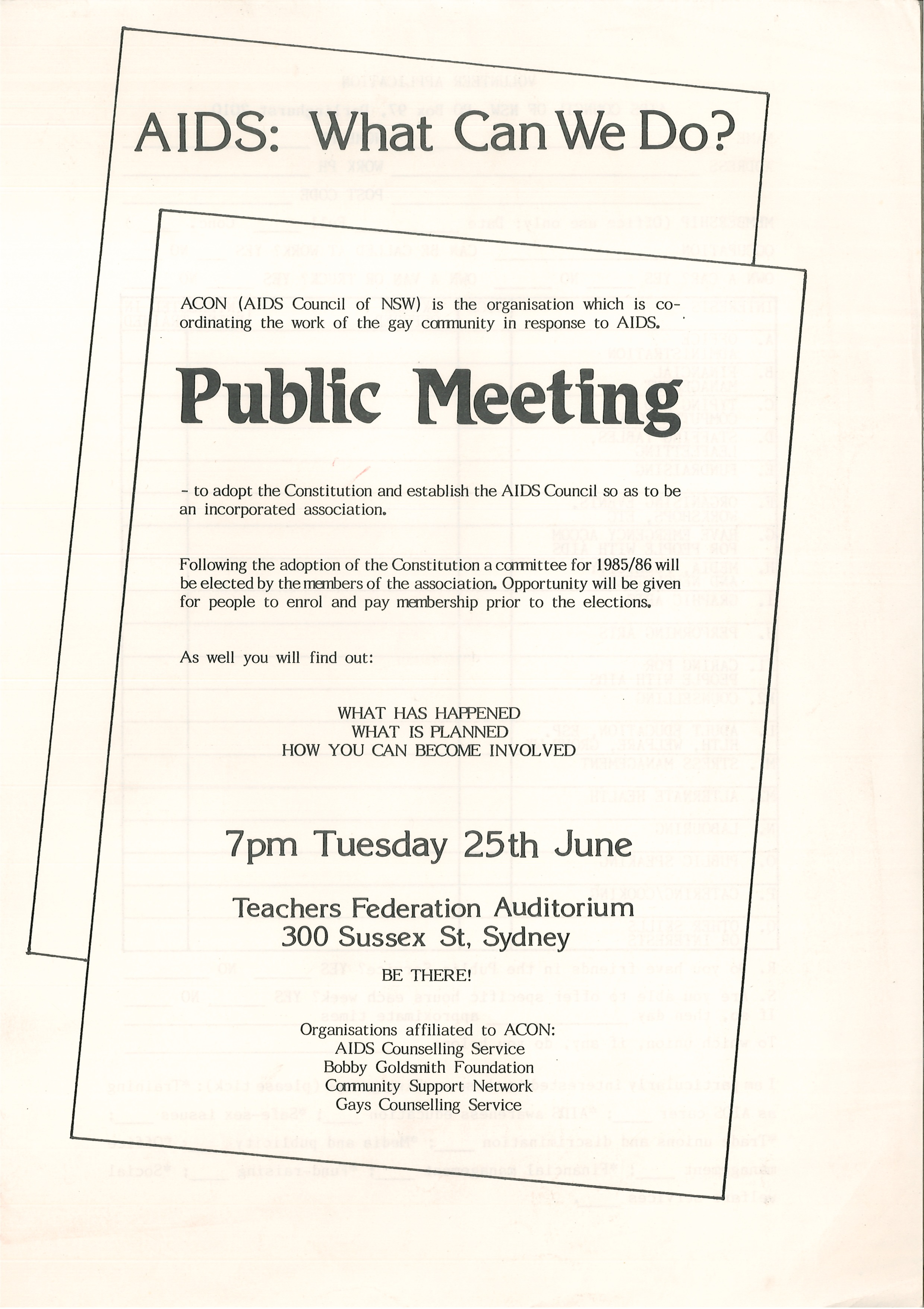 In August 1985, the AIDS Council of New South Wales (ACON) formally incorporated. This followed a public AIDS Forum organised by the NSW AIDS Action Committee, which had been held two years earlier at the Paddington Town Hall on 15 August 1983. Lex Watson served as ACON’s first President.
