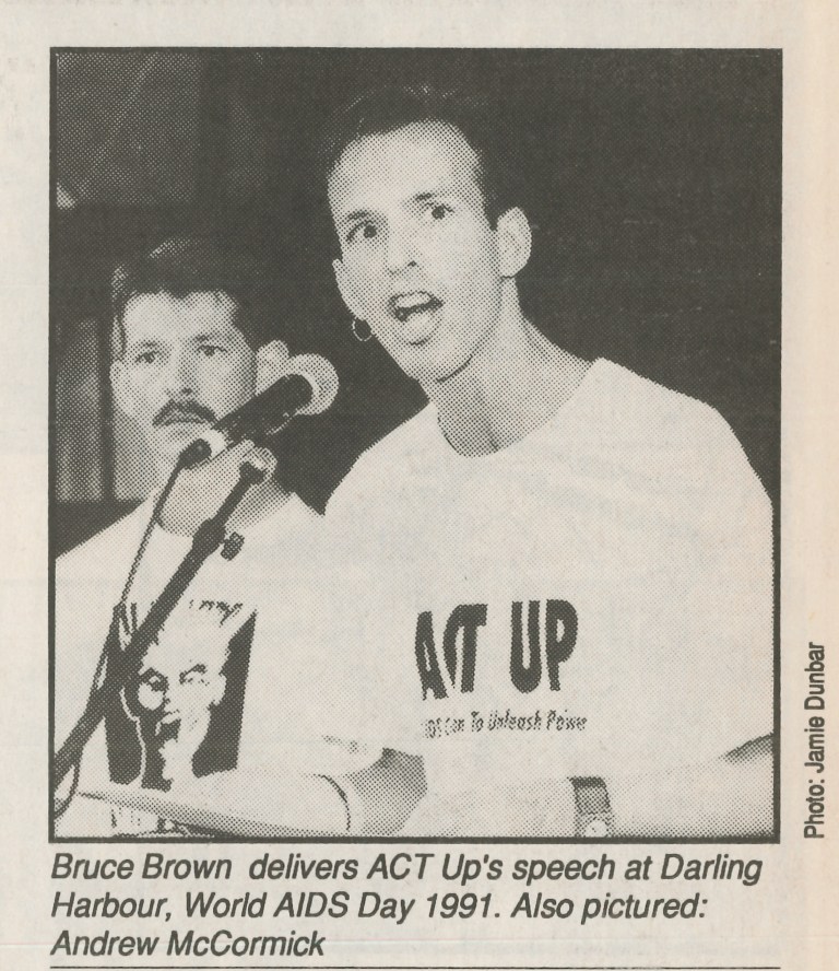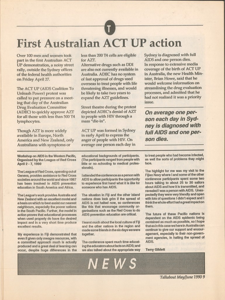 ACT UP was highly active across Australia in the early 1990s, with protests, actions and zaps. ACT UP also drew attention to other issues, such as the treatment in the media of people living with HIV and AIDS.
