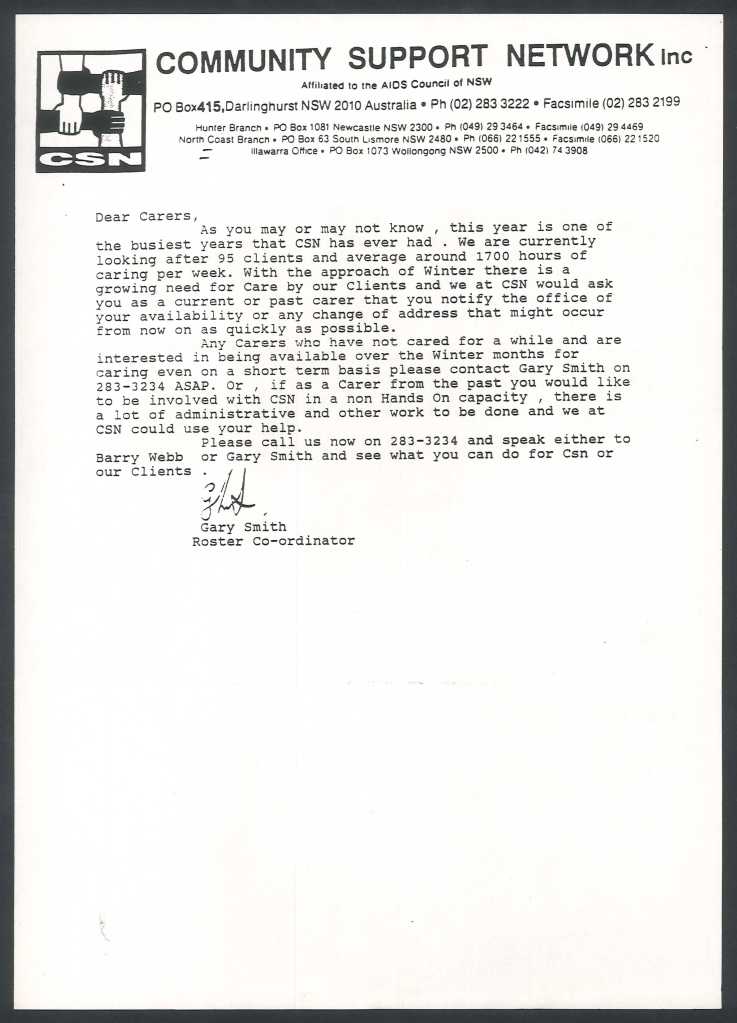 Many volunteered to help in this way because they had friends or families impacted by the epidemic. Others saw that carers were needed and felt they were able to provide this level of support. Historian Jennifer Power notes that in the 1990-1991 financial year, CSN staff and volunteers provided 11,874 shifts for their 173 clients, amounting to more than 72,000 hours of care.